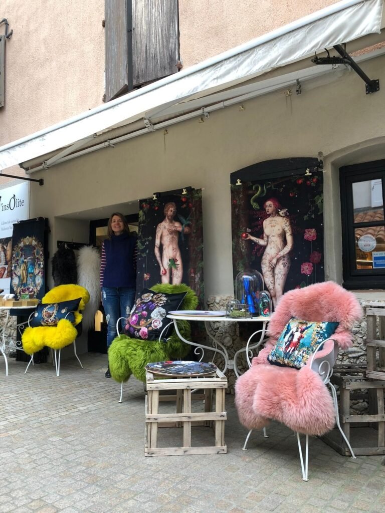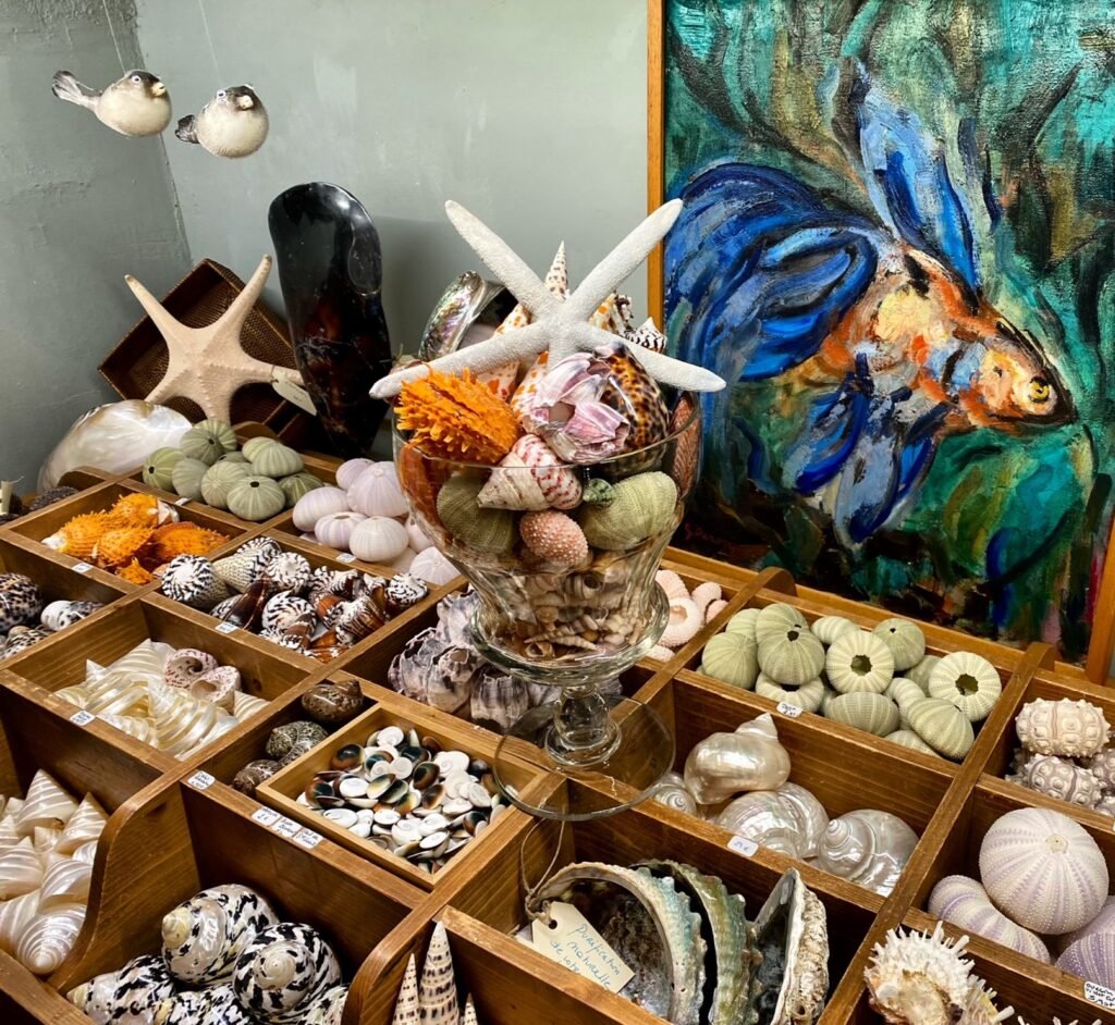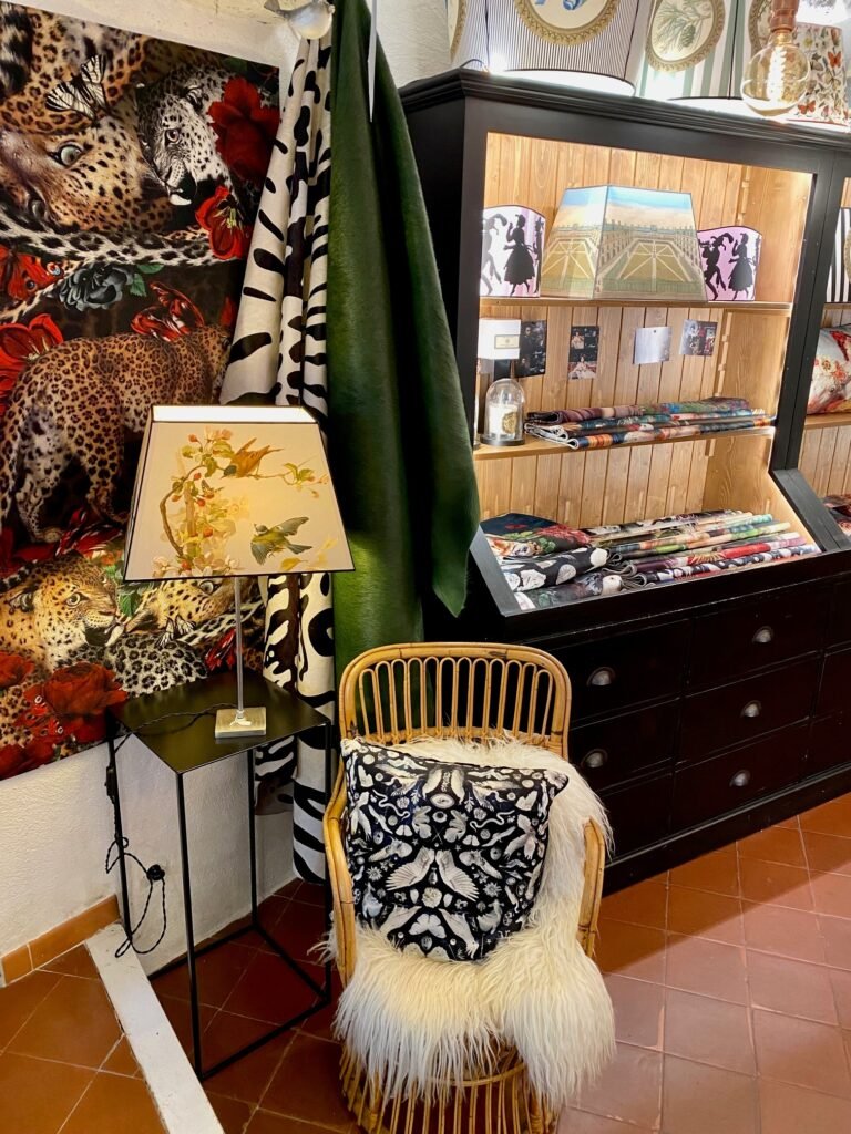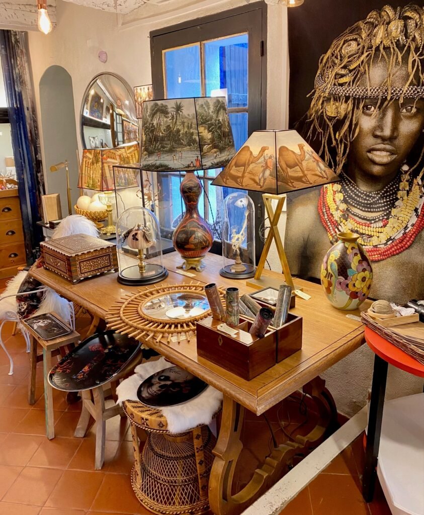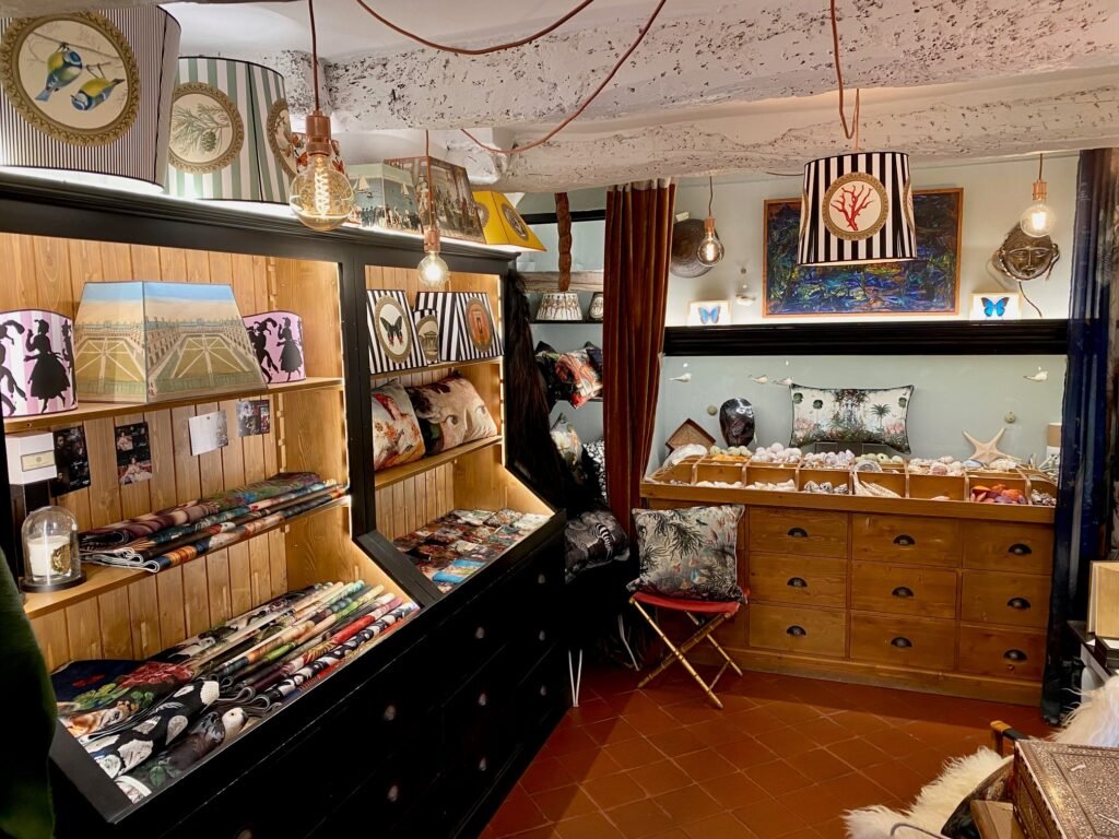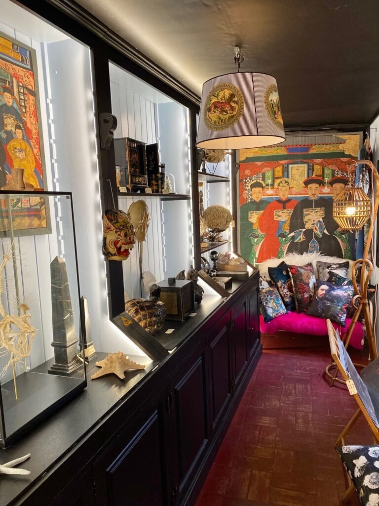 Boutique de décoration d’intérieur : antiquités, vintage, rideaux, coussins, tentures, abat-jours, coquillages et objets de curiosité, peaux de mouton et de vache.