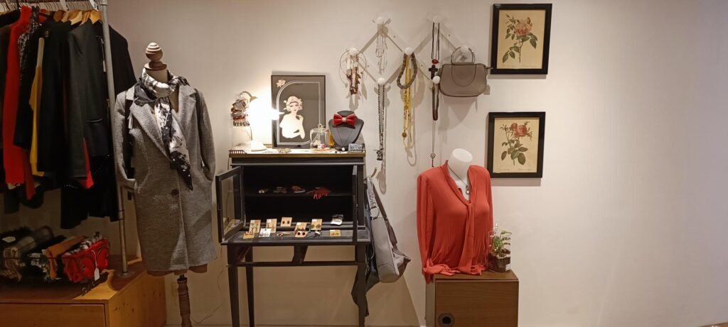 La plupart du mobilier et de la décoration de la boutique ont été chinés pour permettre une adéquation avec le projet et pour vous aider à vous sentir comme dans une friperie d’antan.