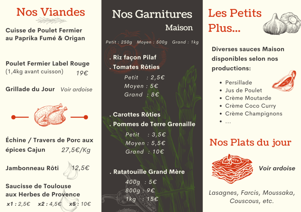 Votre rôtisserie et sa cuisson à la flamme, unique à Saint Aygulf, vous propose diverses préparations faites-maison et ses grillades du jour !