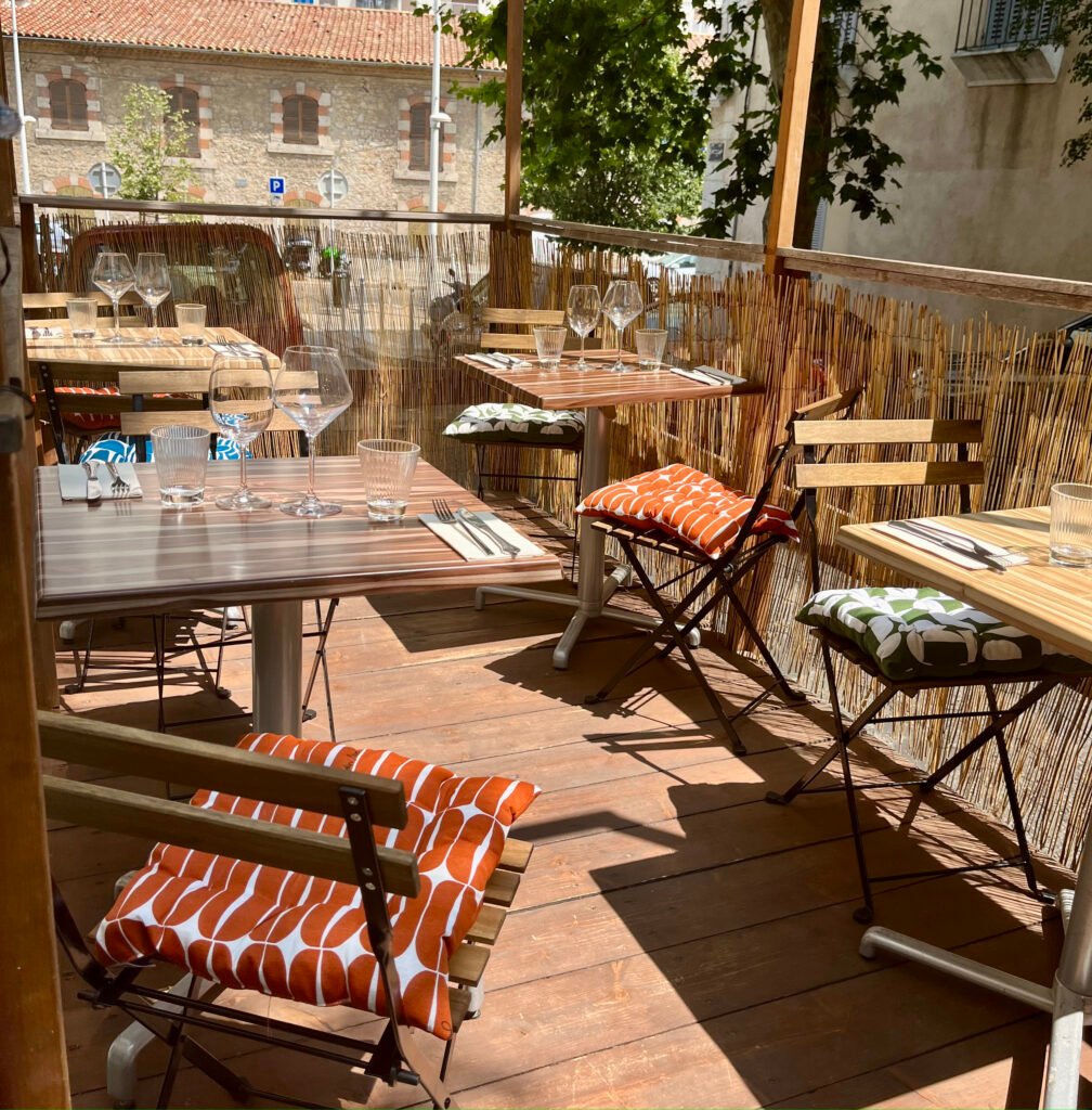 Salle climatisée et terrasse extérieure.